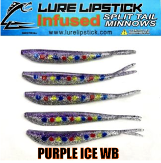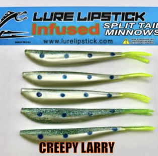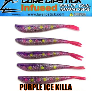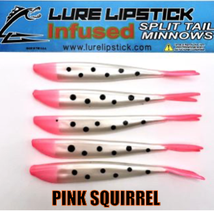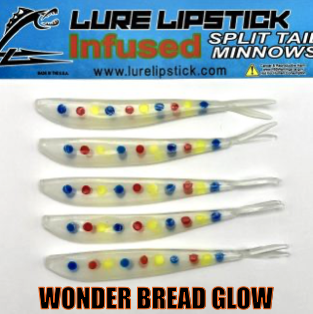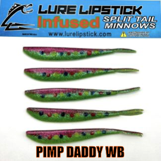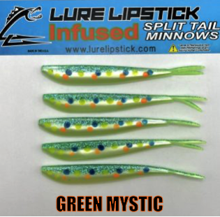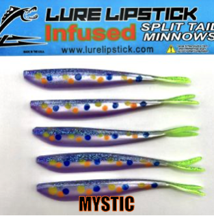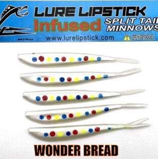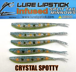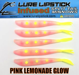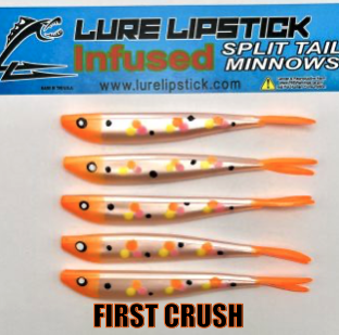 LURE LIPSTICK CUSTOM INFUSED SPLIT TAIL MINNOWS ARE SURE TO GET YOU HIT ON! PHEROMONES AND NATURAL OILS TO GET THE FISH BITING. TRY SOME OUT TODAY! DON’T FORGET TO ADD YOUR FAVORITE LURE LIPSTICK SOFT BAIT ENHANCER! HAND PAINTED AND MADE IN THE U.S.A!!